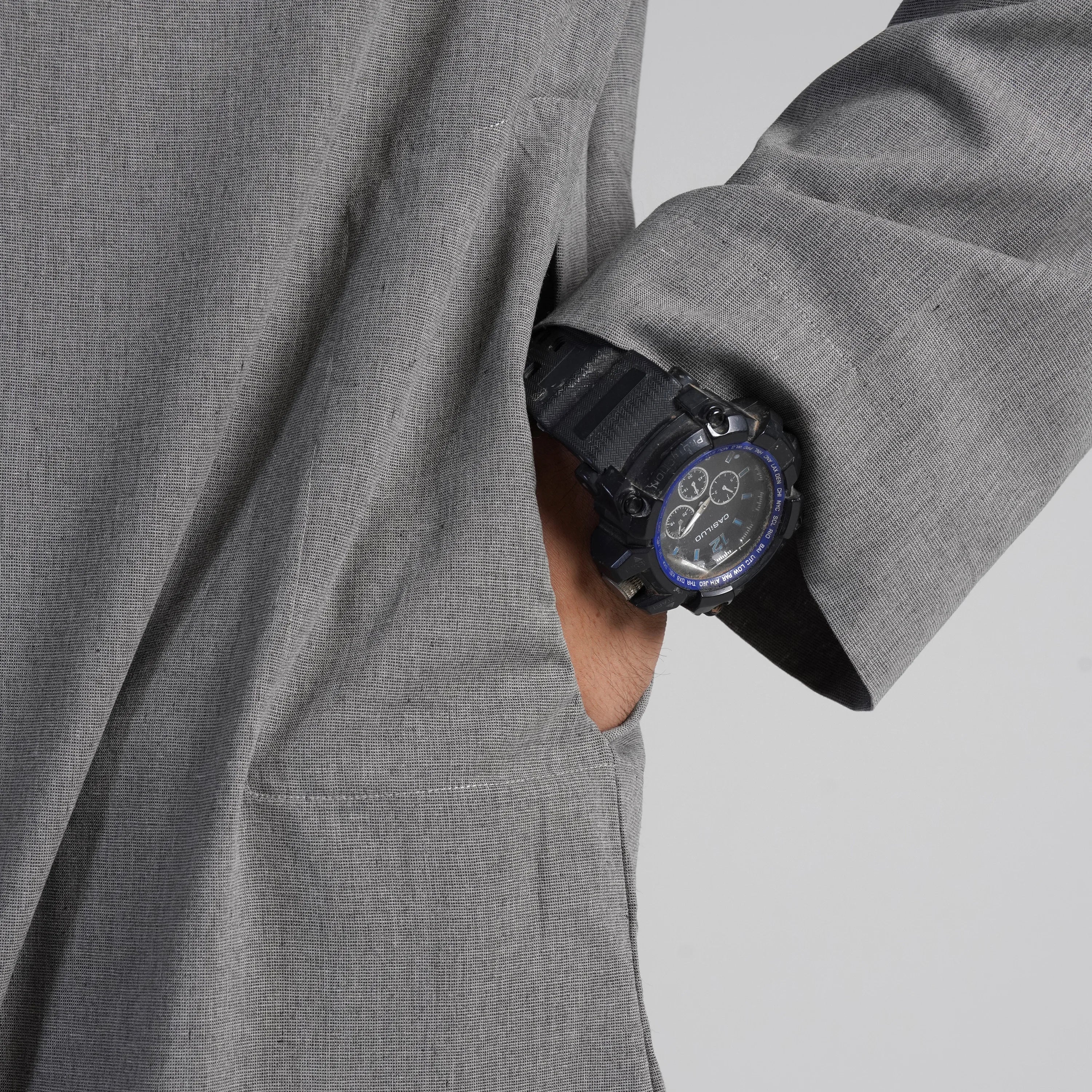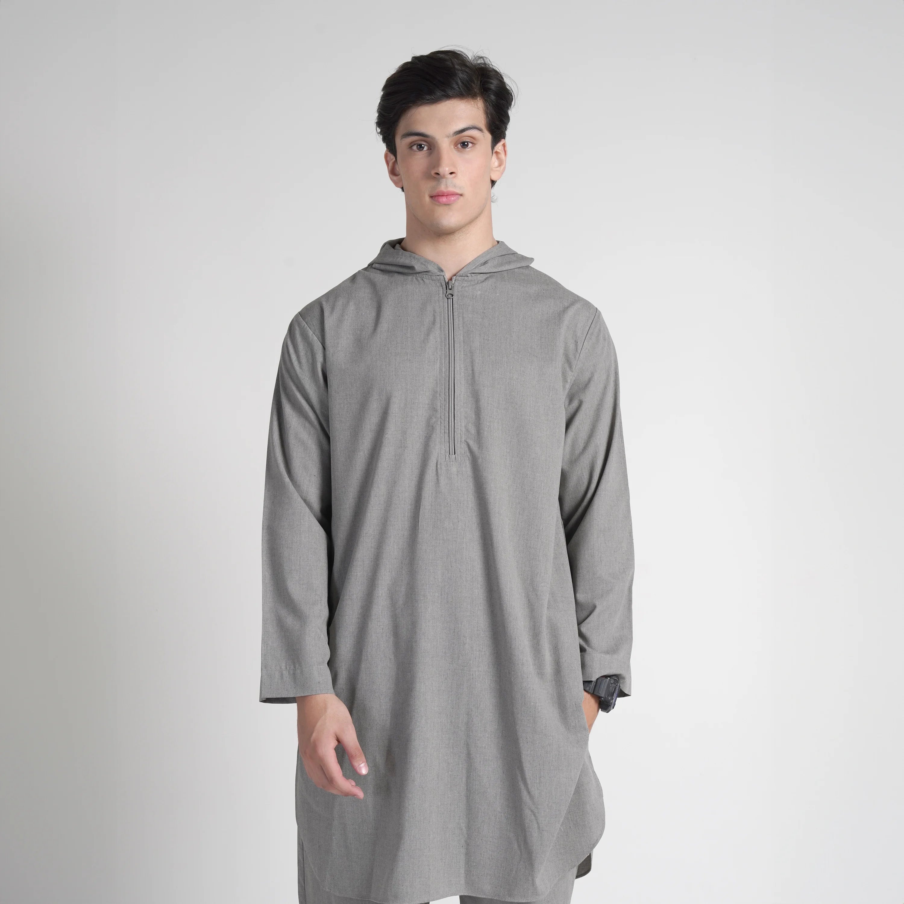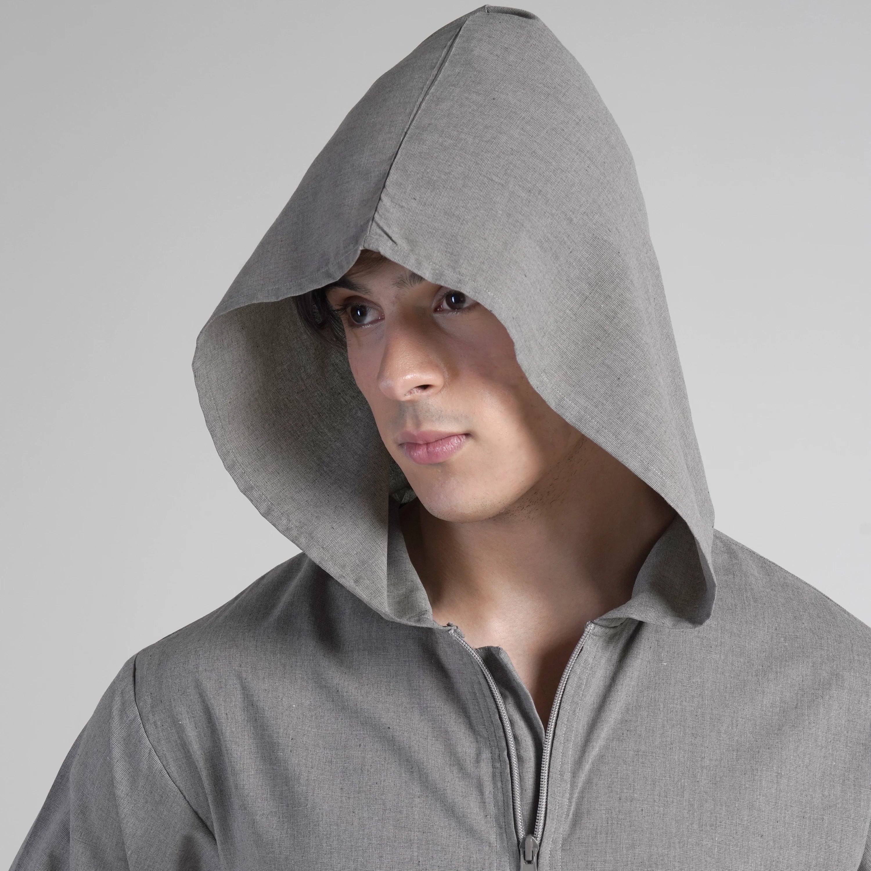 "The Steel Contemporary Kurta Hoodie" – a refreshing blend of modern flair and classic comfort, perfect for your summer wardrobe.