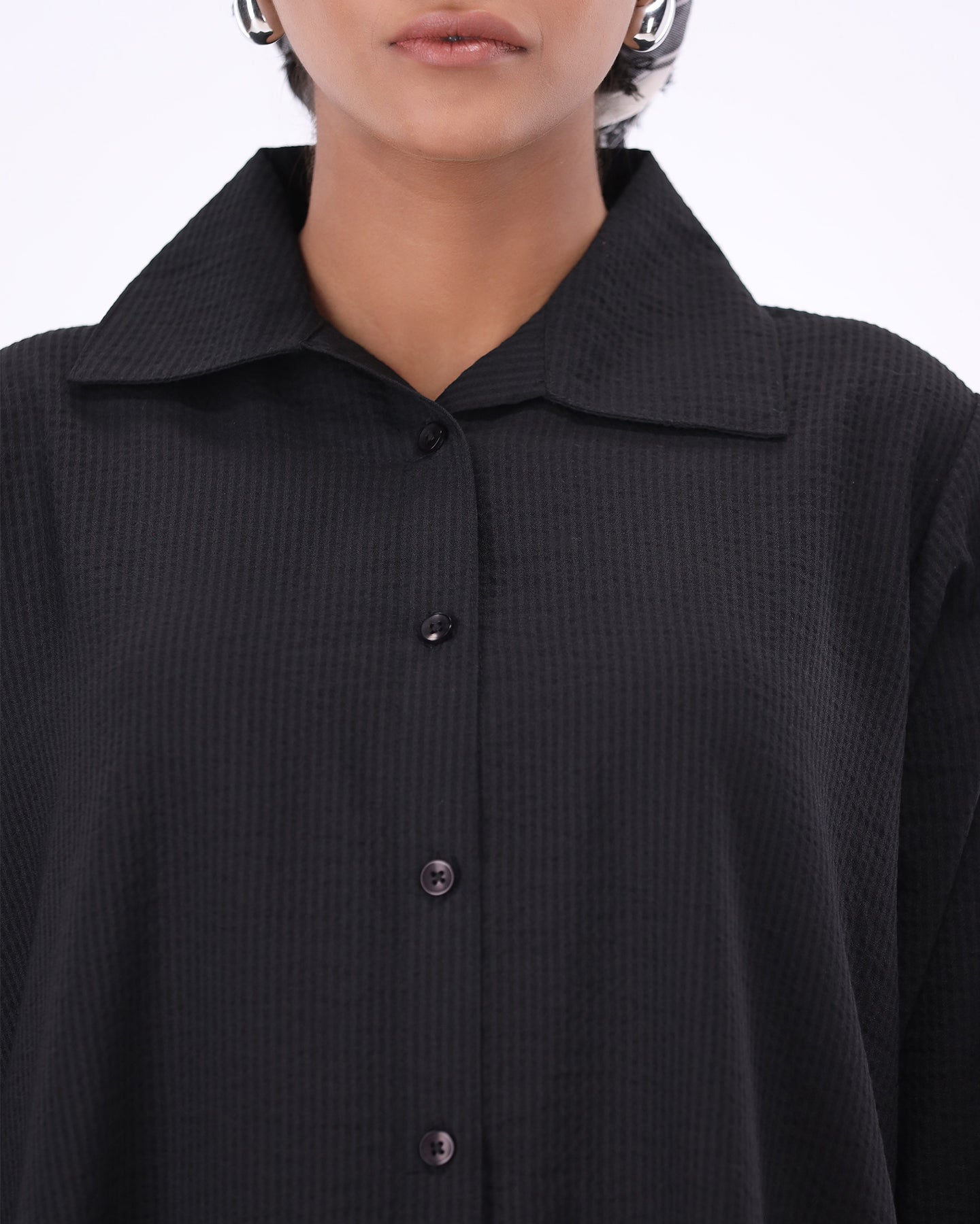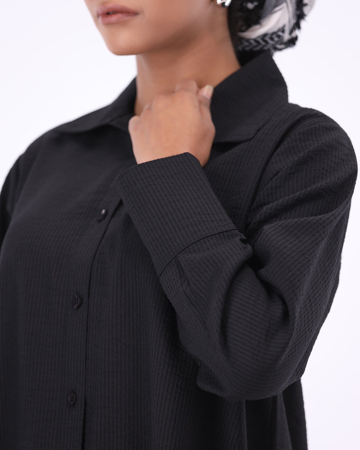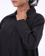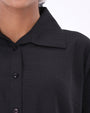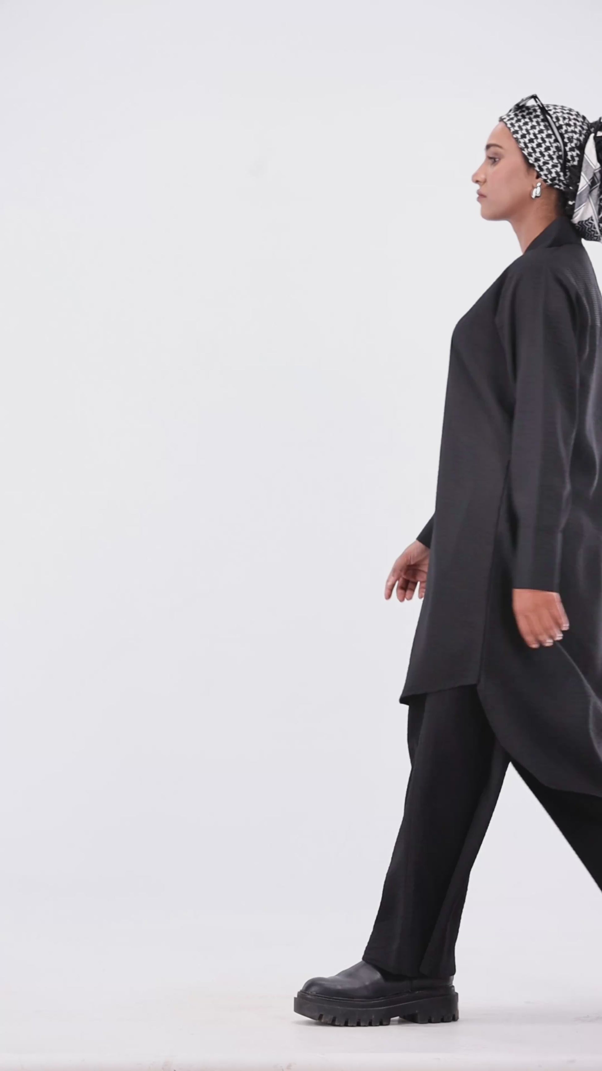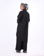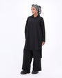 The longline shirt brings effortless proportion with its dropped shoulders and sculpted drape, while the wide trousers maintain modest flow and all-day comfort.