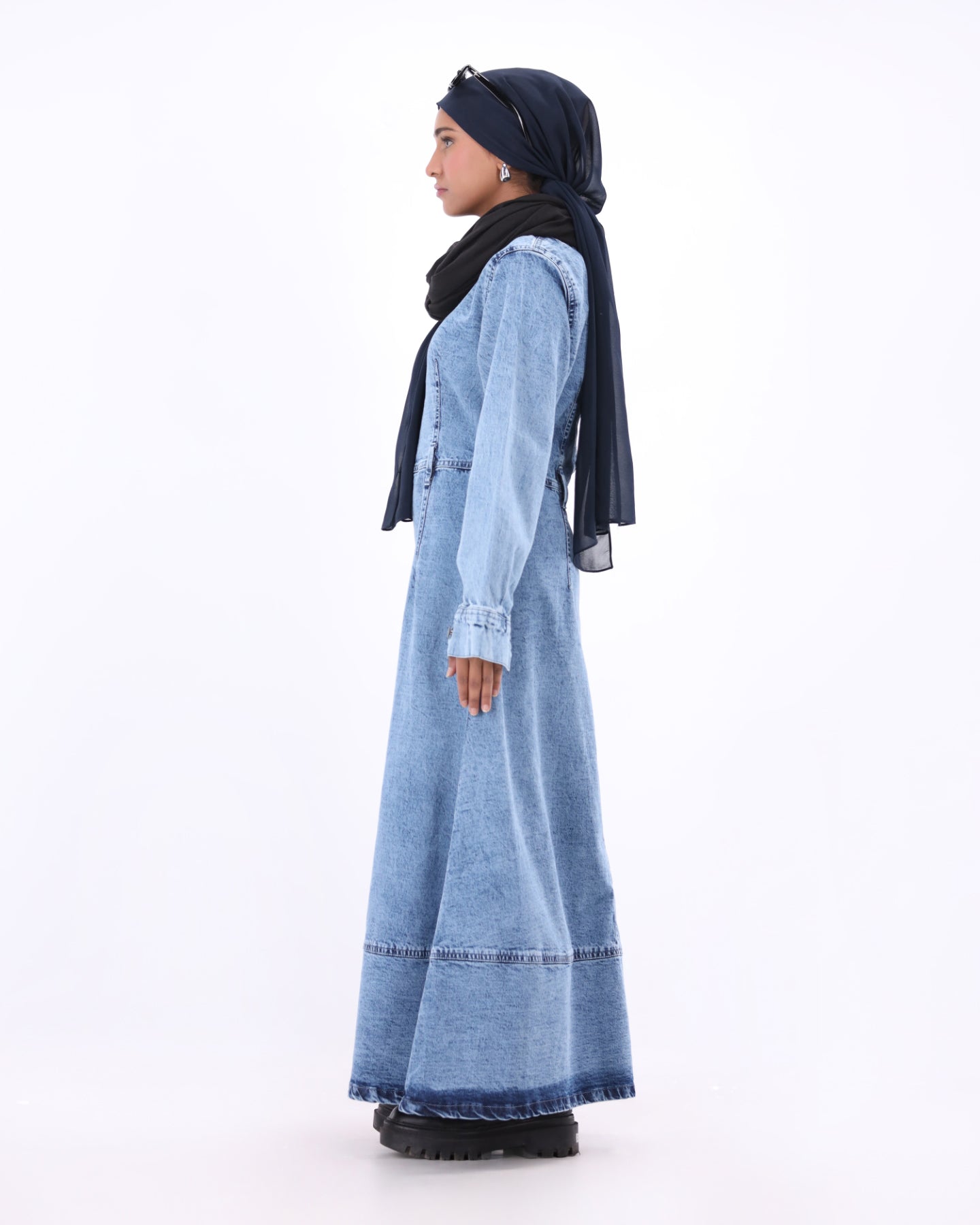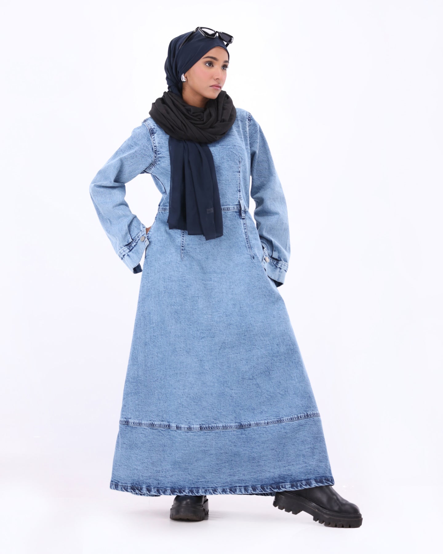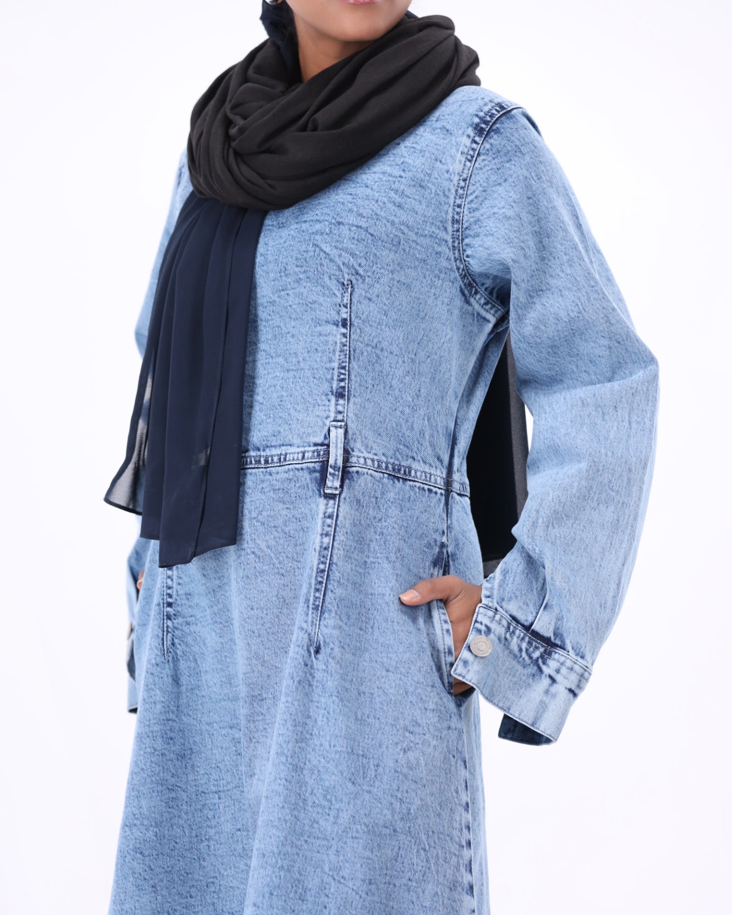 Clean lines. Endless depth. The Horizon Vista Dress captures the balance between flow and form — a full-length denim silhouette designed to move with you, not against you. Its structure is timeless, its presence quietly powerful.