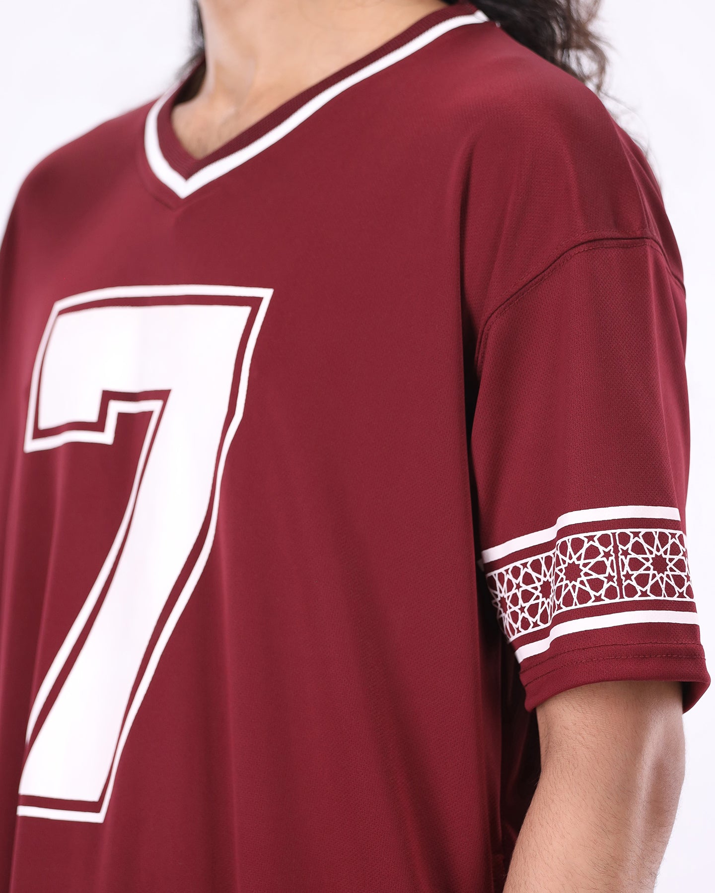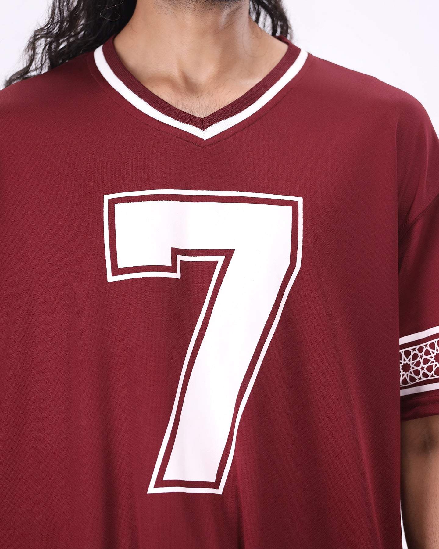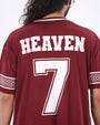 | Design | V-neck rib collar · “7” front graphic · “Heaven 7” back print · Patterned sleeve bands |